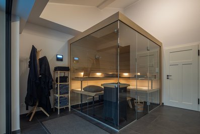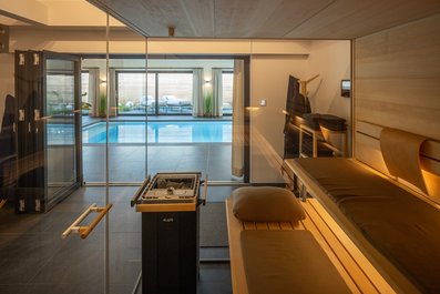Direkt neben dem Poolbereich kann sich die Familie in der KLAFS Sauna AURA erholen. Die Wohlfühloase bietet mit ihrer durchgehenden Glasfront nicht nur eine luxuriöse Optik, sondern auch eine harmonische Verschmelzung aus purer Wohnlichkeit und moderner Ästhetik. Mit den schwebenden Liegen aus Hemlockholz und den weichen Saunakissen entsteht ein edles und zugleich gemütliches Lounge-Flair. Für wohlige Wärme sorgt der hochwertige FERO Saunaofen, der sich in das eindrucksvolle minimalistische Raumdesign einfügt. Das SANARIUM® vollendet das Erlebnis, indem es verschiedene sanfte Badeformen wie das Softdampfbad mit erhöhter Luftfeuchtigkeit bei gleichzeitig niedrigeren Temperaturen ermöglicht. Diese besonderen Features machen jeden Saunagang zu einer intensiven Entspannungsreise – ein perfekter Rückzugsort für Körper und Geist.